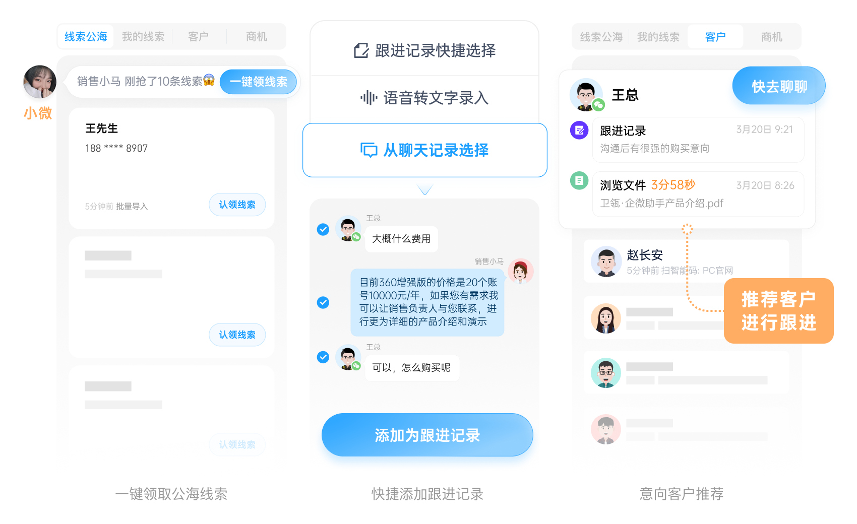 - 一键领取公海线索,快捷添加跟进记录 自动筛选意向客户,智能推荐后续动作